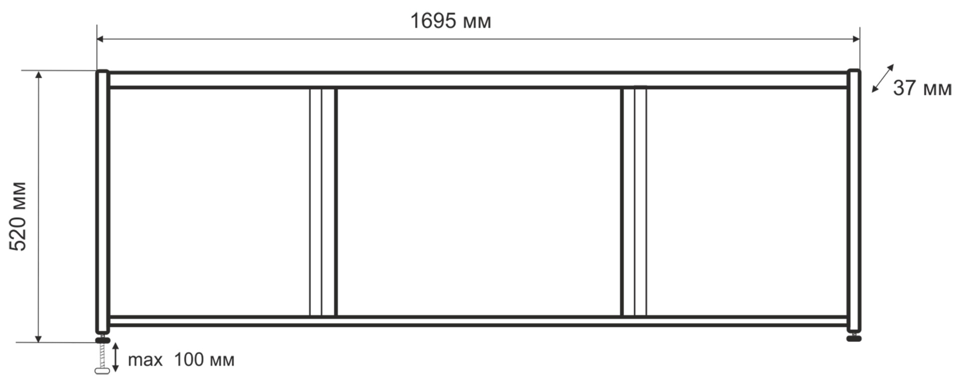 Экран для ванны EMMY Бриз имеет 3 раздвижных створки. Каркас экрана выполнен из алюминиевого профиля, дверки изготовлены из МДФ и покрыты ПВХ пленкой. Ножки регулируются на 10 см. Экран имеет боковые алюминиевые стойки, благодаря которым его можно оснастить торцом для боковой части ванны. Элегантный дизайн с ручками в виде вырезов на дверях делает данное изделие минималистичным, но в то же время стильным и при этом никак не влияет на удобство в использовании.|