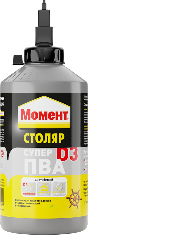 Клей МОМЕНТ ПВА-Супер D3 рекомендуется к применению при изготовлении окон и дверей, мебели для кухни или ванной, для монтажного склеивания паркетных и ламинатных напольных покрытий, а также других деревянных деталей.|