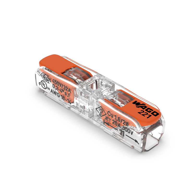 Соединитель WAGO с рычажком 221-2411 предназначен для подключения любых типов медных проводников: моножильных и многопроволочных. Прозрачный корпус позволяет контролировать правильность положения проводника и длину снятия изоляции. Два тестовых отверстия дают возможность измерения электрических параметров цепи без разбора и нарушения изоляции соединения.|