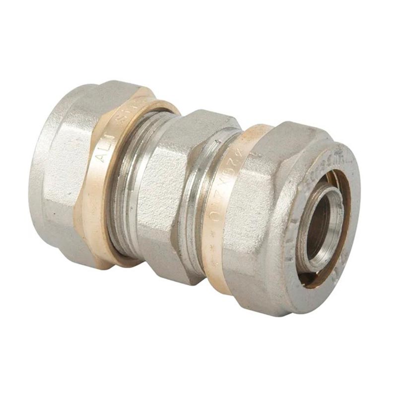 Муфта используется для соединения металлопластиковых труб одинакового диаметра. Труба закрепляется на фитинге с помощью обжимного разрезного латунного кольца, которое обжимает трубу при взаимодействии конусных поверхностей гайки и кольца.|