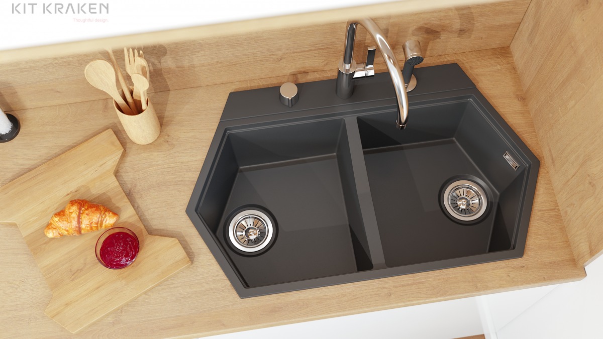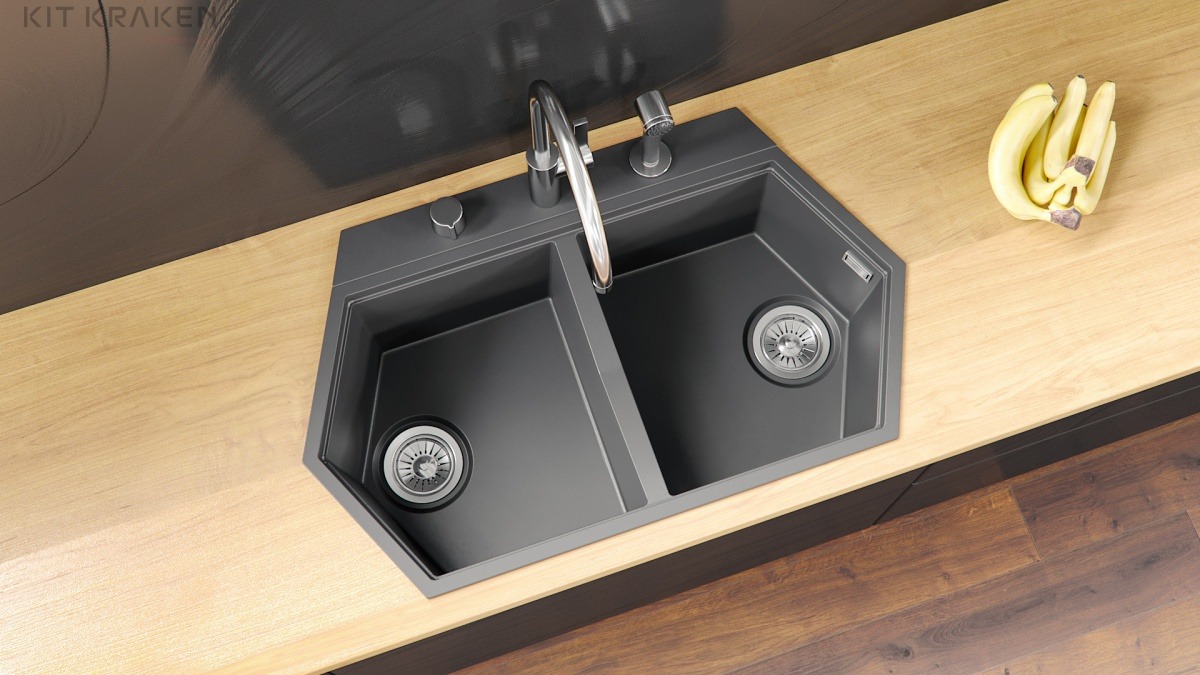 Мойка кухонная KIT KRAKEN Gulf имеет две полноценные вместительные чаши, где удобно одновременно готовить и складывать грязную посуду. Мойка может монтироваться как на столешницу, так и под неё.|