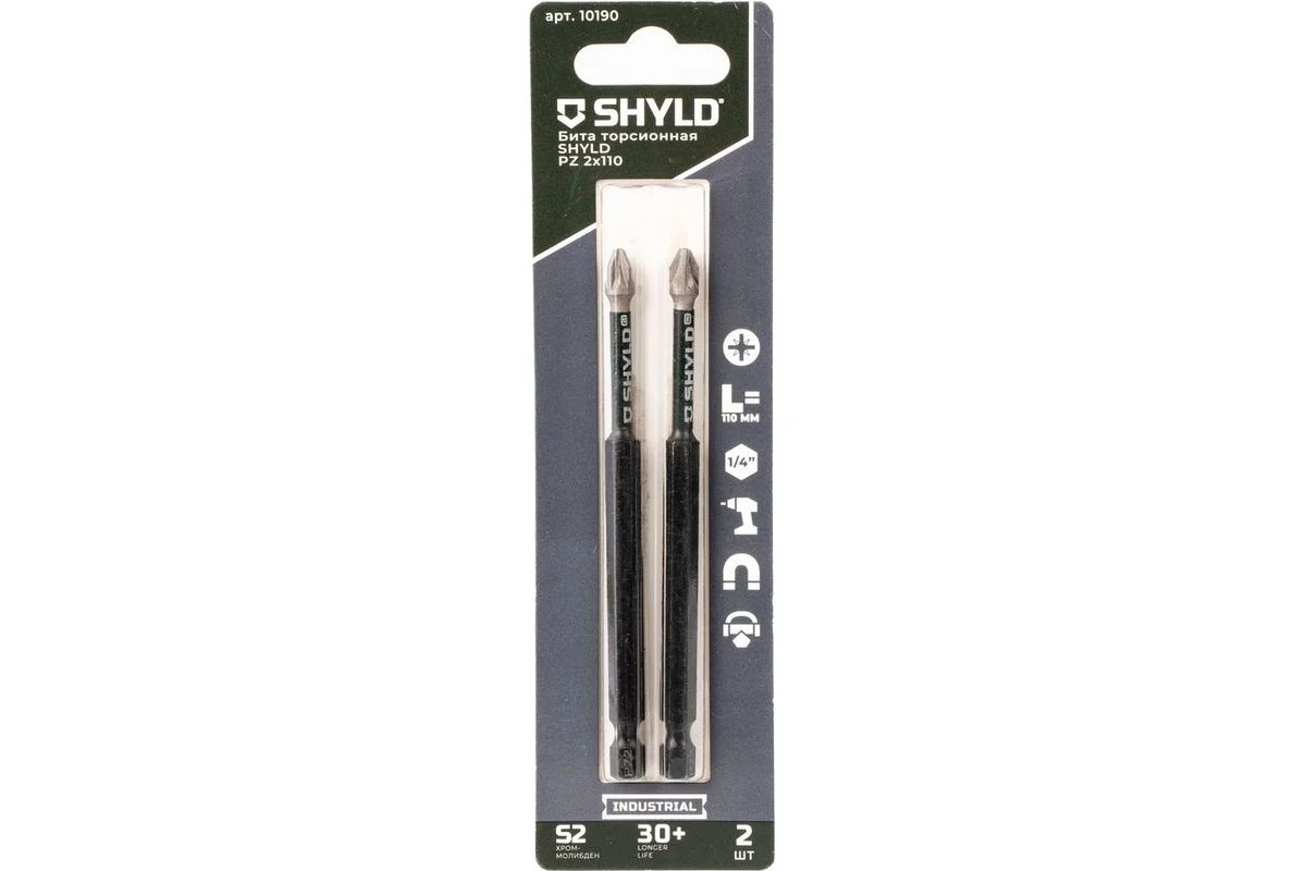 Биты SHYLD хорошо передают крутящий момент, что исключает повреждение винта или заготовки. Изготовлены из легированной инструментальной стали S2. Бита обладает магнитными свойствами, что позволяет удерживать саморез или шуруп в любом удобном положении. Особая структура стали для торсионных бит одновременно увеличивает твердость и ударную вязкость металла. Обладают большим ресурсом службы и стойкостью к износу, а также эффективными антикоррозийными свойствами. Магнитная рабочая часть биты надежно удерживает крепеж при работе и облегчает работу мастера. Тангенциальный удар от шуруповерта лучше амортизируется, позволяя равномерно распределить нагрузку по бите и избежать поломки. Утонченная геометрия заточки гарантирует точную фиксацию биты в крепеже при любой нагрузке, даже при слабом давлении на инструмент. Термическая обработка бит увеличивает износостойкость металла без коробления основы и негативного влияния на пластичность и прочность самой биты.В набор входит: