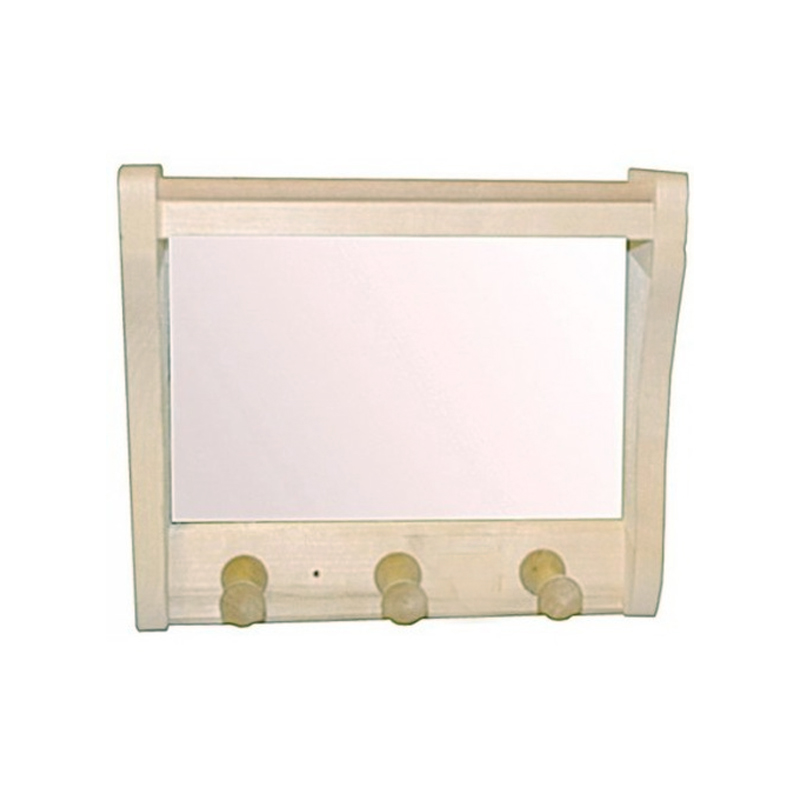 Полка для бани может быть использована как по прямому назначению — для хранения и сушки полотенец, так и в декоративных целях. Данная модель оборудована крючками для одежды и зеркалом.|
