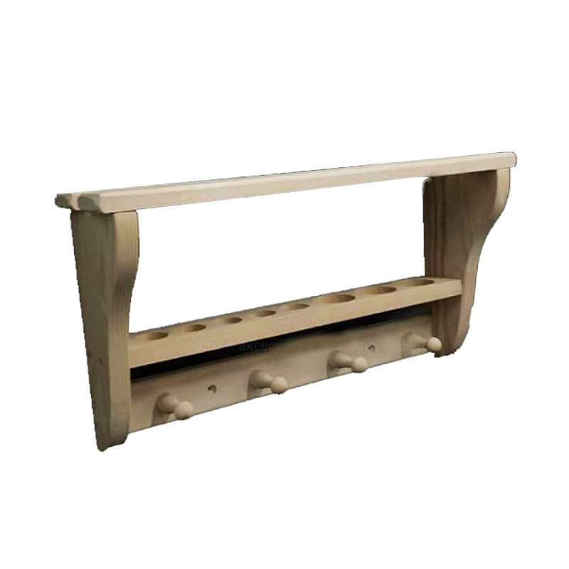Полка для бани может быть использована как по прямому назначению — для хранения и сушки полотенец, так и в декоративных целях. Данная модель оборудована крючками для одежды и отверстиями для размещения небольших флаконов.|