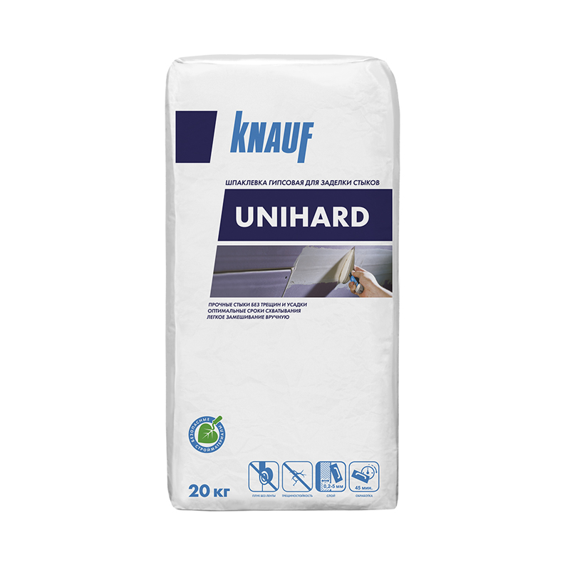 Шпатлевка для швов KNAUF Унихард — сухая высокопрочная смесь на гипсовом вяжущем с полимерными добавками для внутренних работ. Применение средства для заделки стыков листов с полукруглой утоненной кромкой может производиться без использования армирующей ленты.Преимущества: