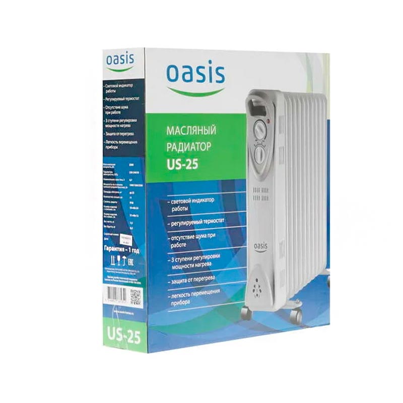 Радиатор OASIS US-25 очень удобен в использовании, прост в установке, а также обладает повышенной теплоотдачей и эффективным распределением воздушного потока. Высокий уровень безопасности достигается электрозащитой класса II, а также предусмотренной защитой от перегрева. Заземление и уровень защиты соответствуют европейским стандартам.Предусмотрено три ступени мощности нагрева. Оборудован световым индикатором работы. На корпусе имеется небольшой отсек для хранения скрученного кабеля.
