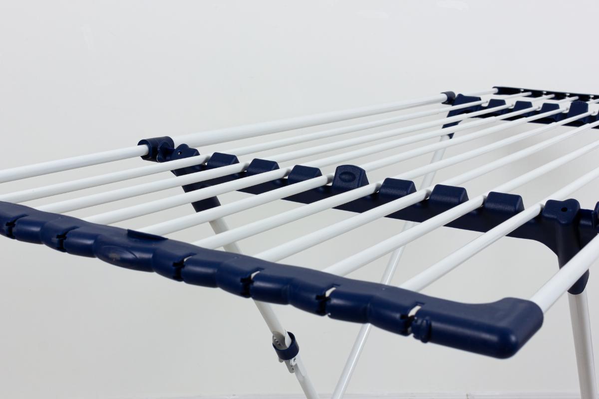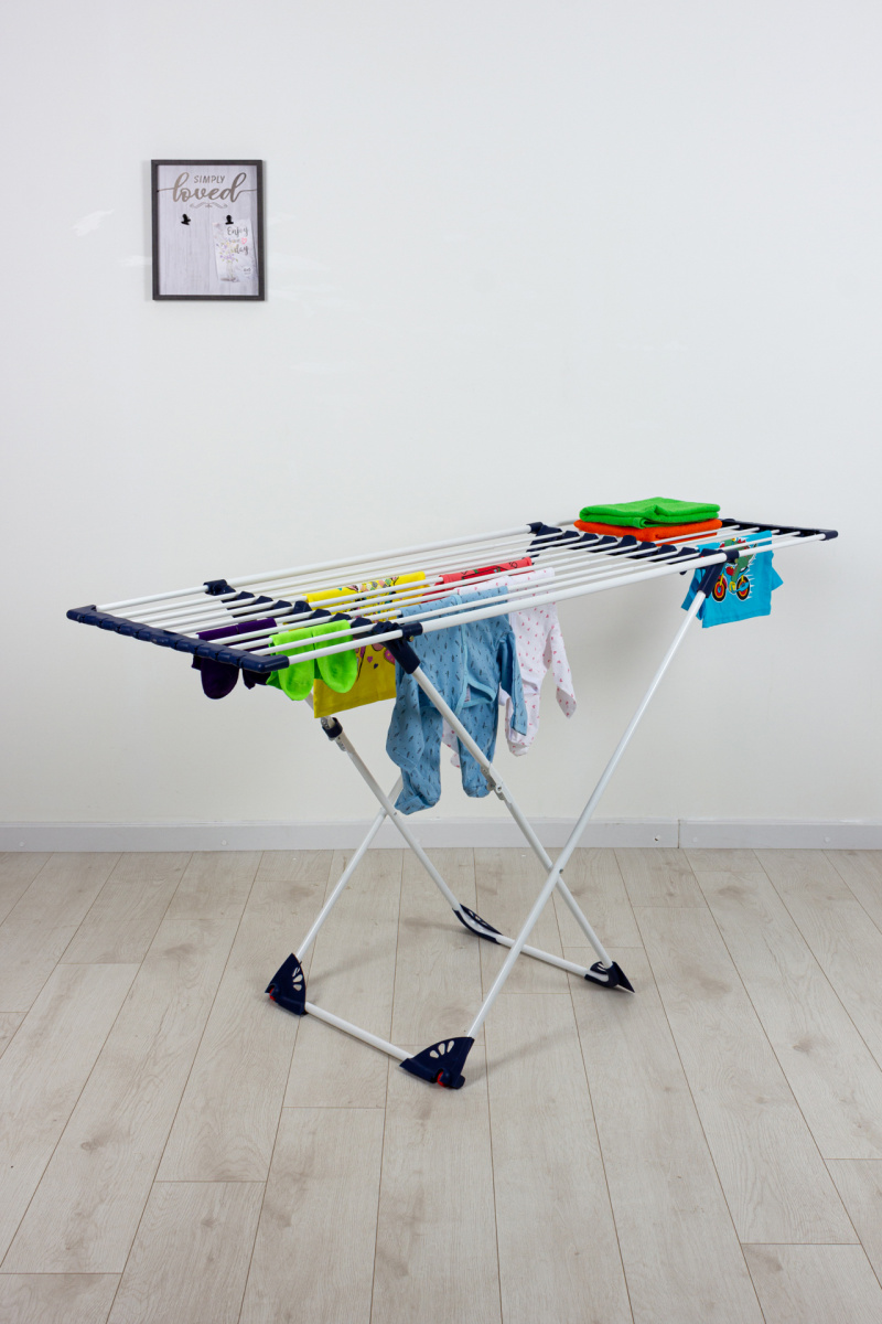 Раздвижная телескопическая сушилка для белья с откидным фиксатором, обеспечивающим возможность сушки громоздкого белья, зажимы для развешивания небольших предметов одежды, колесики для легкого перемещения.|