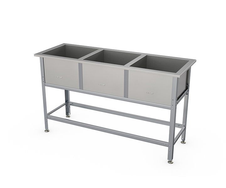 Ванна-мойка предназначена для использования в моечном отделении на предприятиях общественного питания для мытья, дезинфекции и ополаскивания использованной посуды. Мойка ванны выполнена из легированной стали. Ножки ванны снабжены регуляторами высоты, что позволяет при установке устранять возможные неровности пола. Все кромки ванны-мойки имеют подгиб, что полностью исключает получение травмы персоналом при сборке, эксплуатации и санитарной обработке ванны. Углы ванны заварены и зашлифованы, что обеспечивает гигиеническую безопасность и облегчает санитарную обработку ванны.|