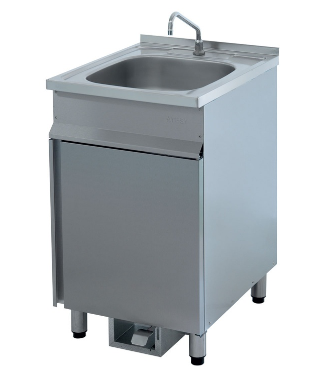 Ванна-рукомойник предназначена для использования в производственном и моечном отделении предприятий общественного питания, а также в передвижных киосках–тонерах для мытья рук работников. Раковина и корпус ванны-рукомойника выполнены из пищевой нержавеющей стали. Корпус имеет закрытый объем, который можно использовать для хранения средств очистки и гигиены. Подача воды в ванне-рукомойнике с педалью осуществляется с помощью педального механизма, который расположен в нижней части корпуса рукомойника, и служит для регулирования напора воды. Механизм приводится в действие нажатием на педаль ногой, обеспечивая быструю подачу воды. Слив воды из ванны-рукомойника в канализацию производится через сифон.|