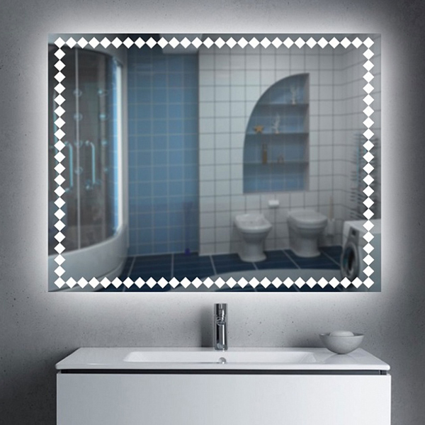 Зеркало устойчиво к влаге, электрические части также защищены от пыли и влаги, а края зеркал обработаны специальной резиной, что увеличивает срок эксплуатации. Зеркало со светодиодной круговой подсветкой (холодный свет) и дополнительной подсветкой короба. Дополнено сенсором выключения на касание.|