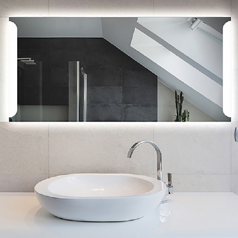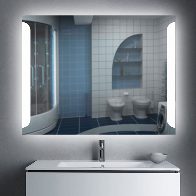 Зеркало с прямыми углами, светодиодной подсветкой (холодный свет) и дополнительной подсветкой короба. Несмотря на то, что подсветка у зеркал не круговая, благодаря светорассеивающему пластику светится не только рисунок, но и короб, а также стены рядом с зеркалом, создавая эффект MB-Light.|